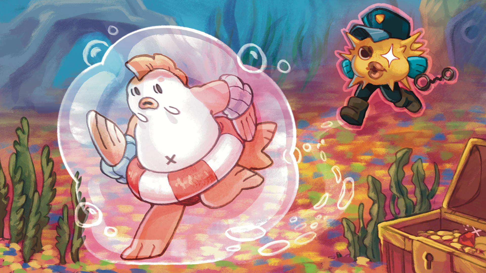 Both fight to collect the most rubbish in the aquarium to build up their special attacks! Don't let them burst your bubble.
