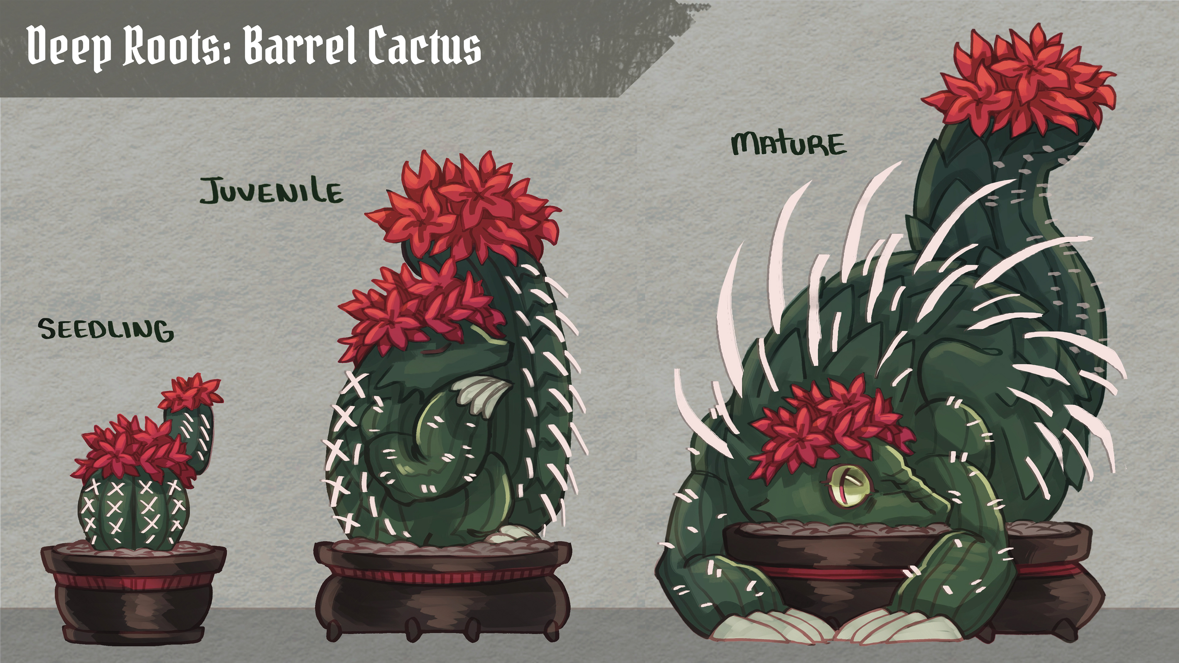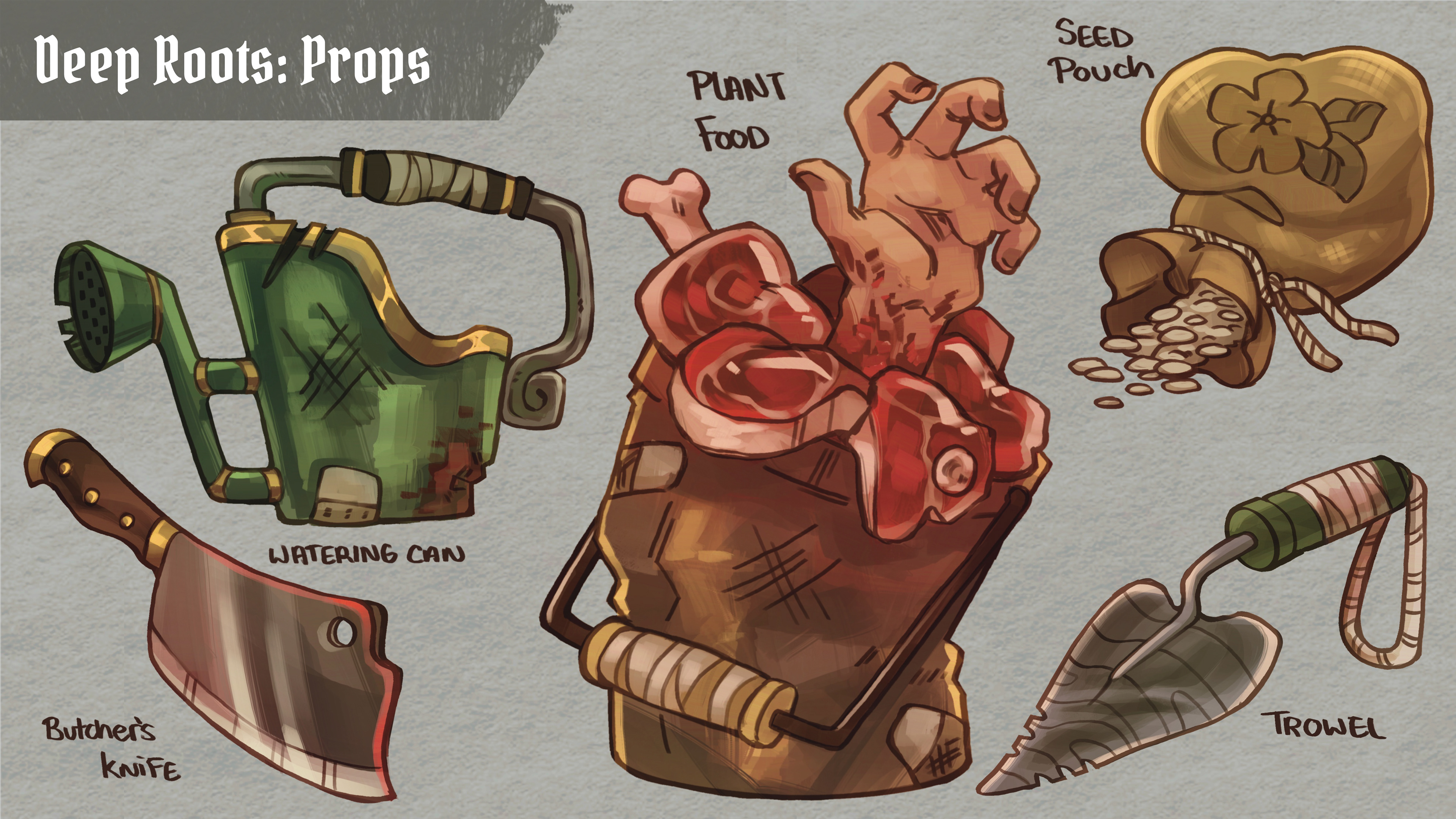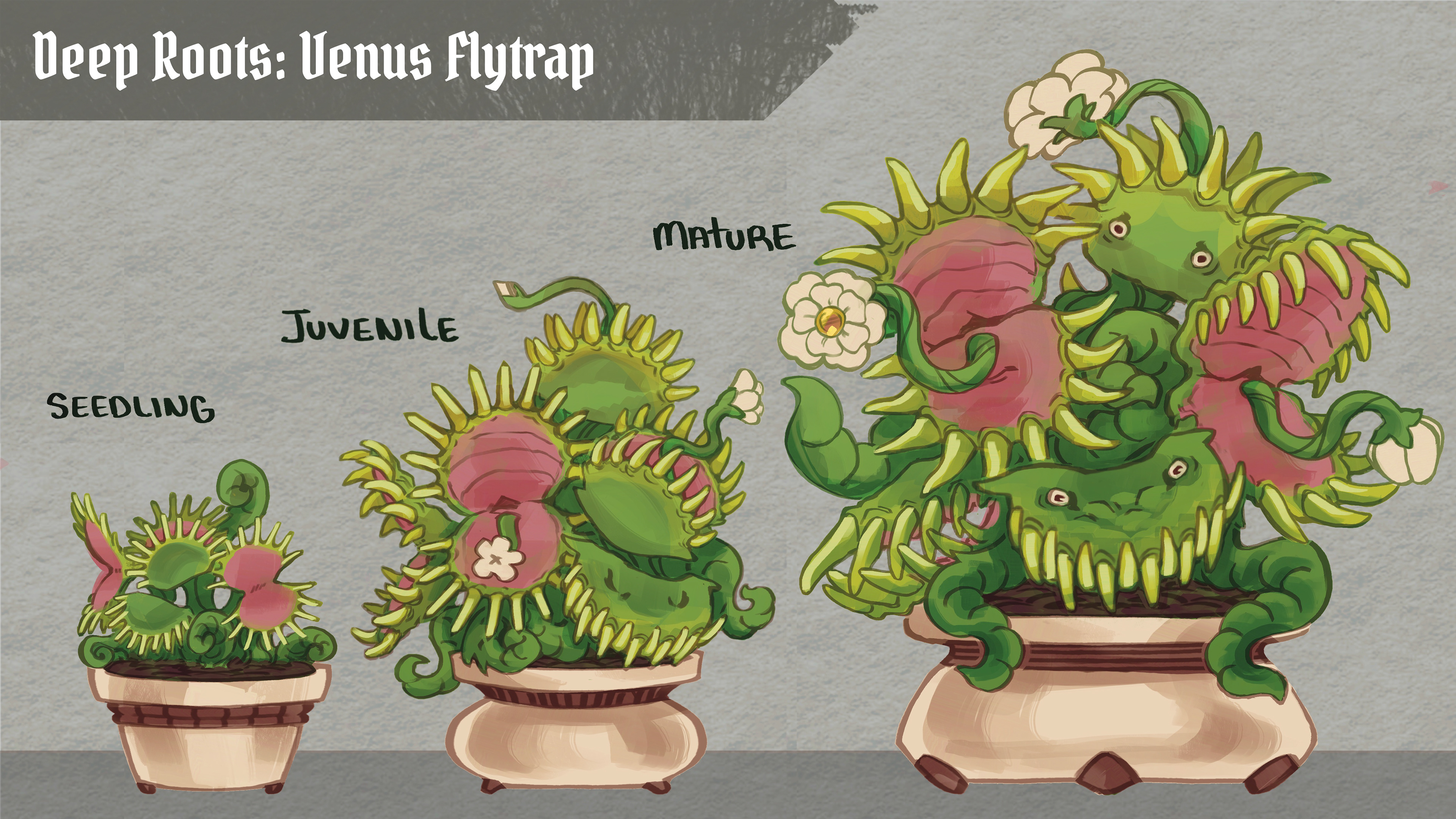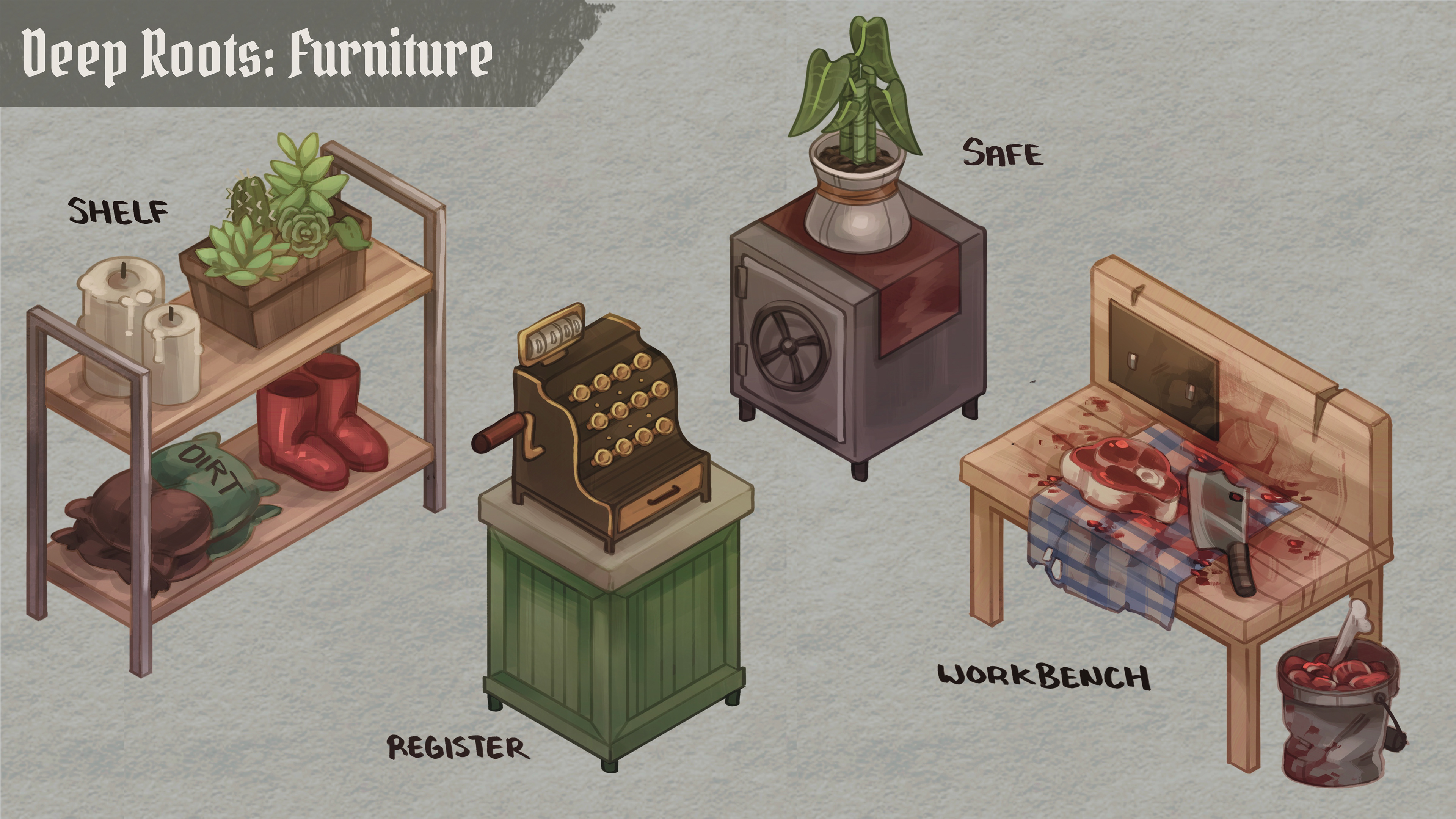 Developmental work for a horror-style farming sim game. In "Deep Roots" you are a botanical shop owner, managing wares and interacting with customers, meanwhile taking care of your monstrous plants. While they sell particularly well, it is hard to stay under the radar once townsfolk start disappearing one by one. It is up to you to keep all of the plants fed, avoid the sheriff's suspicions, and make a profit.