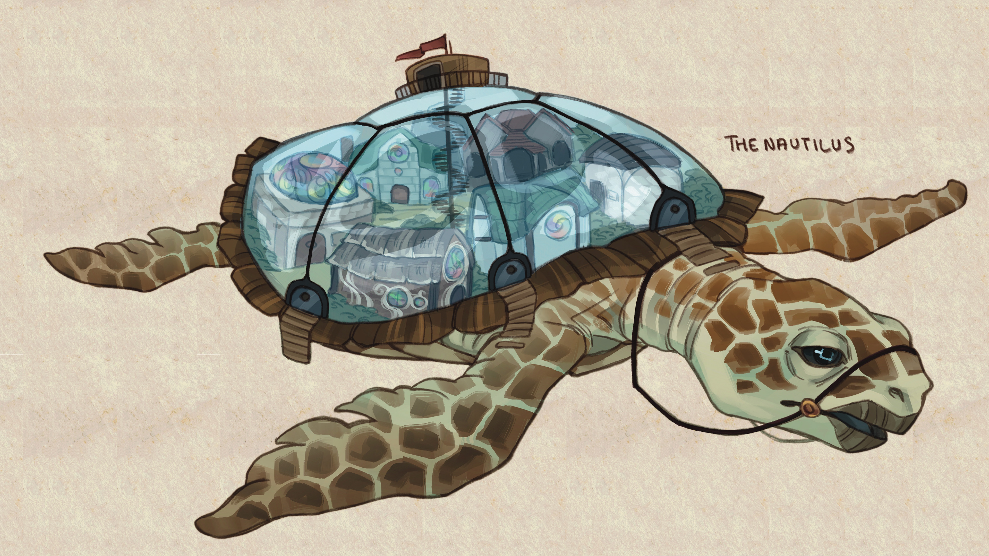 The "Nautilus" is a magnificent giant space turtle, whom Nemo has made his vessel. Inside this cosmic turtle's shell is the Nautilus compound, holding Nemo's library, living quarters, and plenty of astonishing arcane technology.