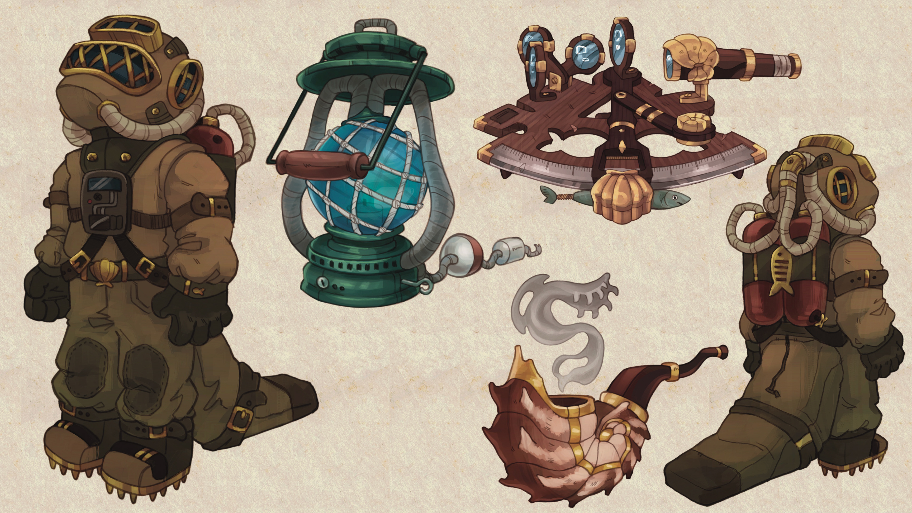 The Professor's dive suit, Conseil's lantern, Captain Nemo's sextant & pipe.